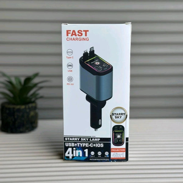 4 in 1 Starry Sky Car Charger – Fast Charging + Ambient Light Projector (Type-C, iOS, USB, PD 3.0) ₹ 899 ONLY