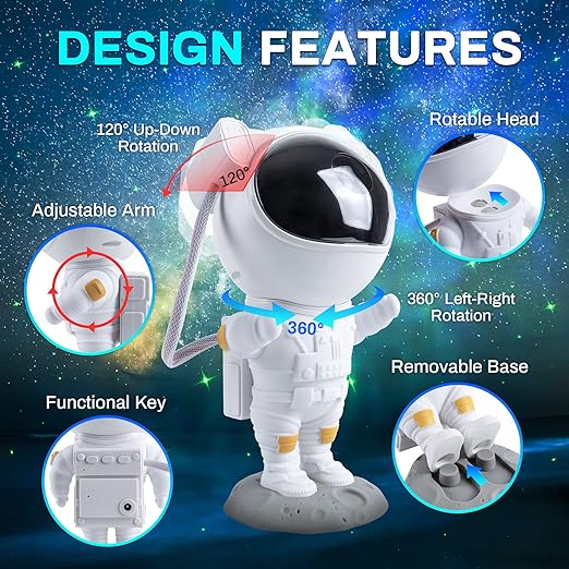 Astronaut Nebula Star Projector: This star projection night light simulates the stunning aurora pattern. It allows you to play either the nebula or the starlight separately or together.✨ When you project it onto your room's wall or ceiling, the Milky Way's nebula-flowing galaxy effect instantly creates a calming atmosphere.[With Remote Control and Timer]: You may customize the projection effect you want for any room by adjusting the brightness, frequency of blinking, and running speed of the green stars and nebula with the remote control.Additionally, the led star night light projector has two timed settings (45 or 90 minutes), which allow you to easily obtain lighting freedom by having it automatically turn off when you fall asleep beneath a starry sky.