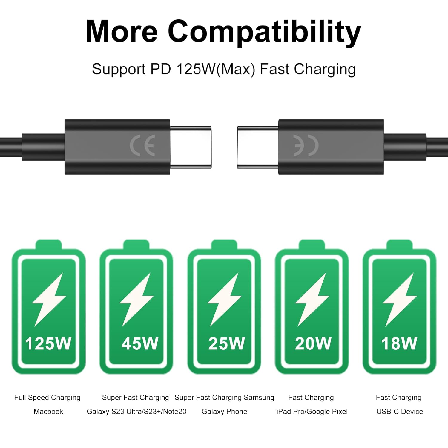. Super Fast Charging Cable: Compatible with the fast USB-PD power delivery protocol, this USB-C to USB-C cable supports up to 125W TurboPower Charge for Motorola laptops, tablets, and cell phones. It can be used as a replacement for the original charge cable and is universally compatible with other brands of original USB-C wall chargers.