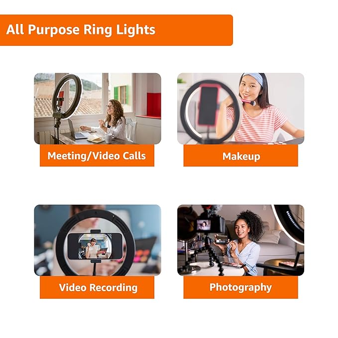 Tech novo - Compatible with iPhone/Android phones and cameras, this 10-inch LED RGB ring light comes with a tabletop tripod stand and a hot shoe adapter for photo and video shoots, live streaming, makeup applications, and vlogging.