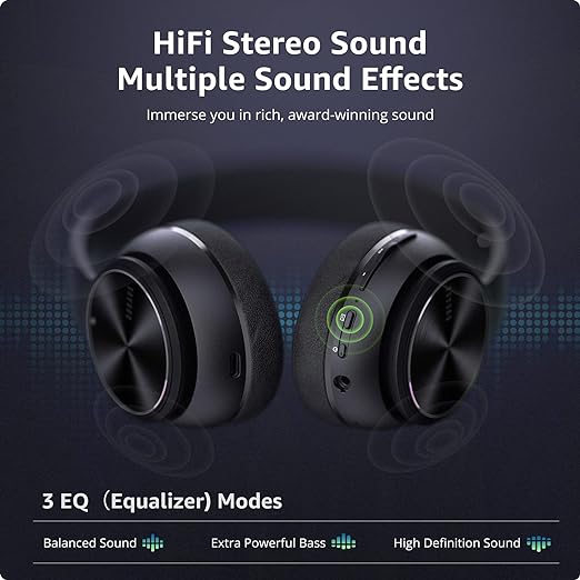 •【Three EQ Modes】The DOQAUS Bluetooth headphones offer three sound effects—heavy bass, balanced, and high-definition vocals—with lossless music output and input. All you have to do to switch to HD sound quality is click the EQ button. With these wireless headphones, you may enjoy the best sound quality without being constrained by cords or distance.