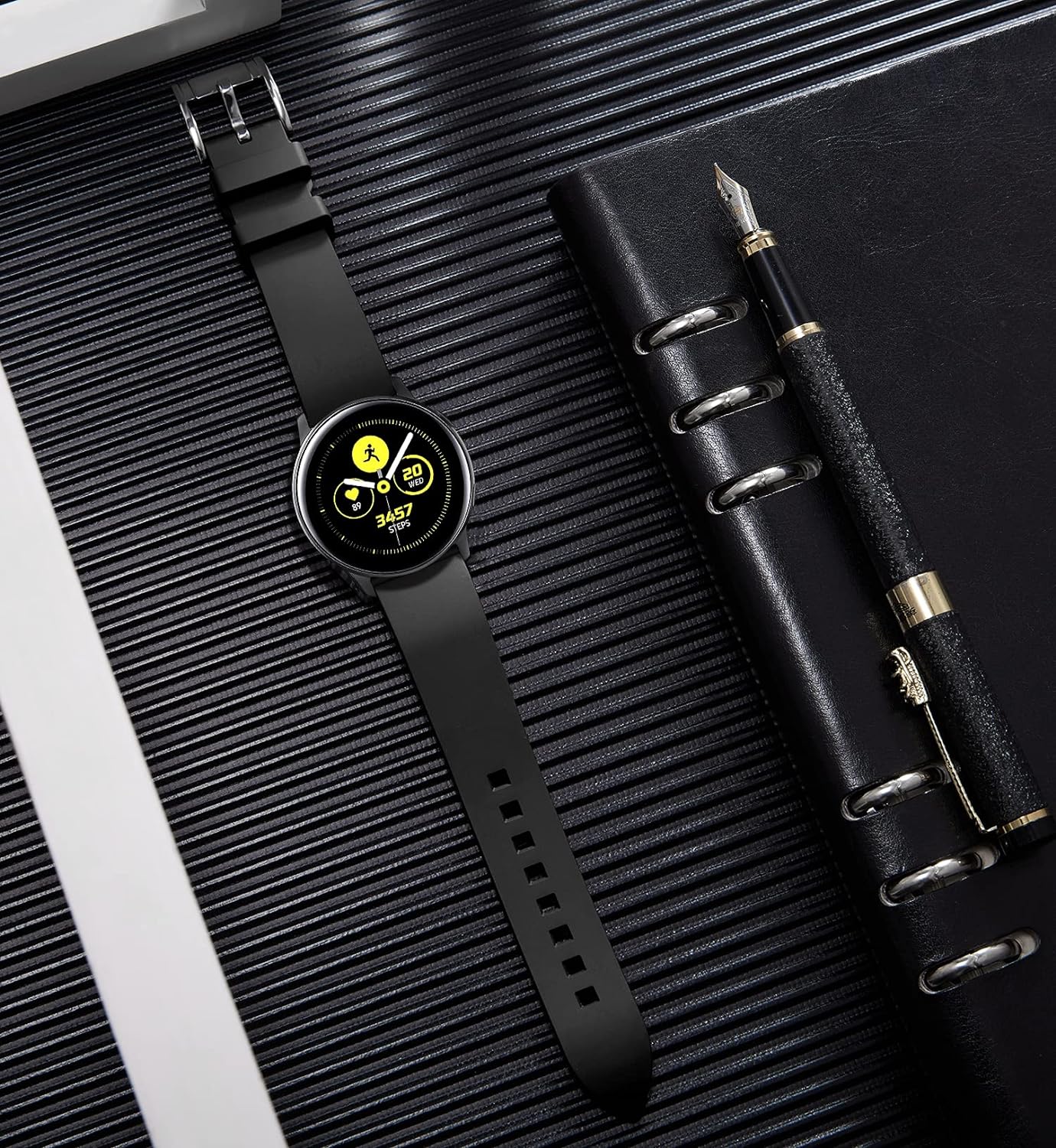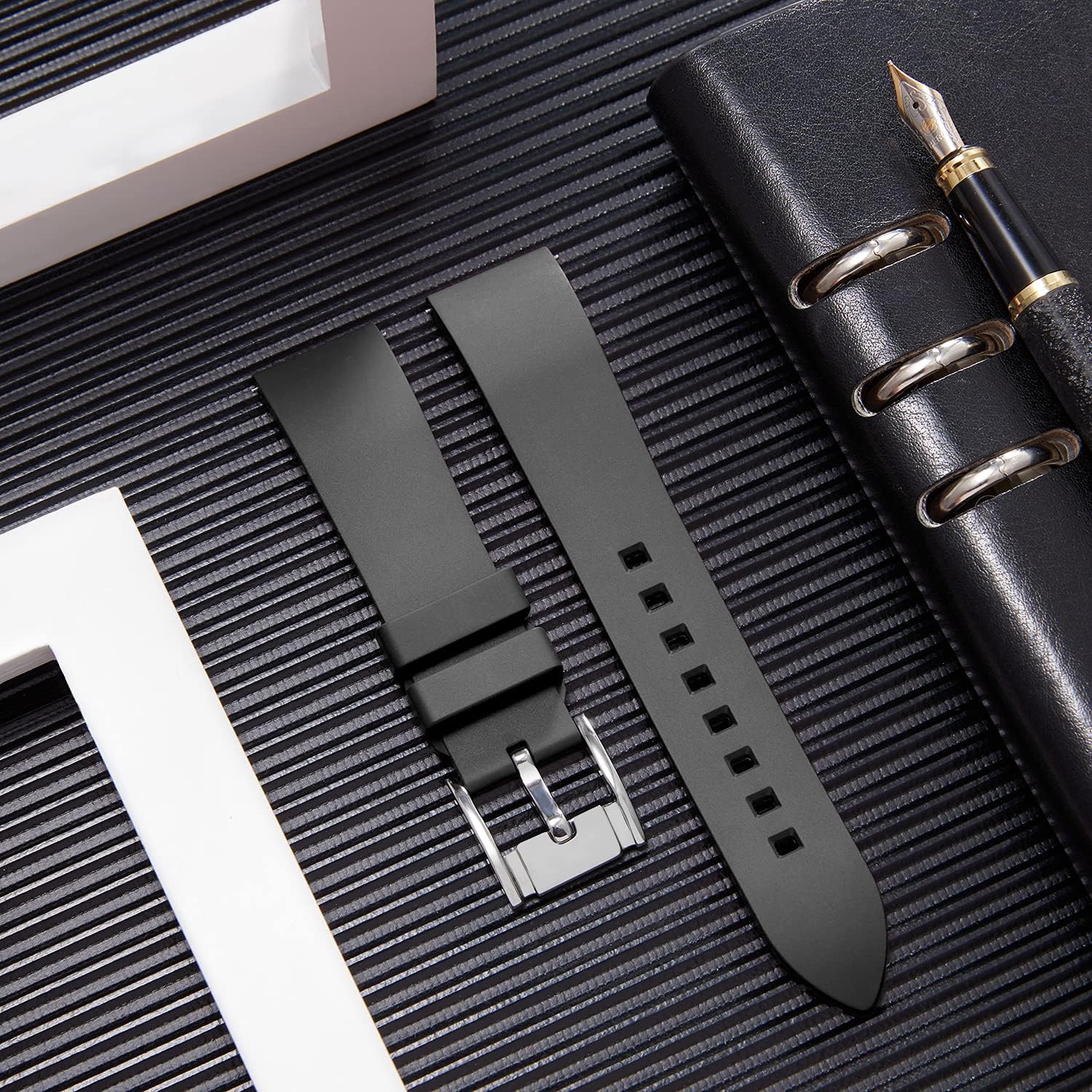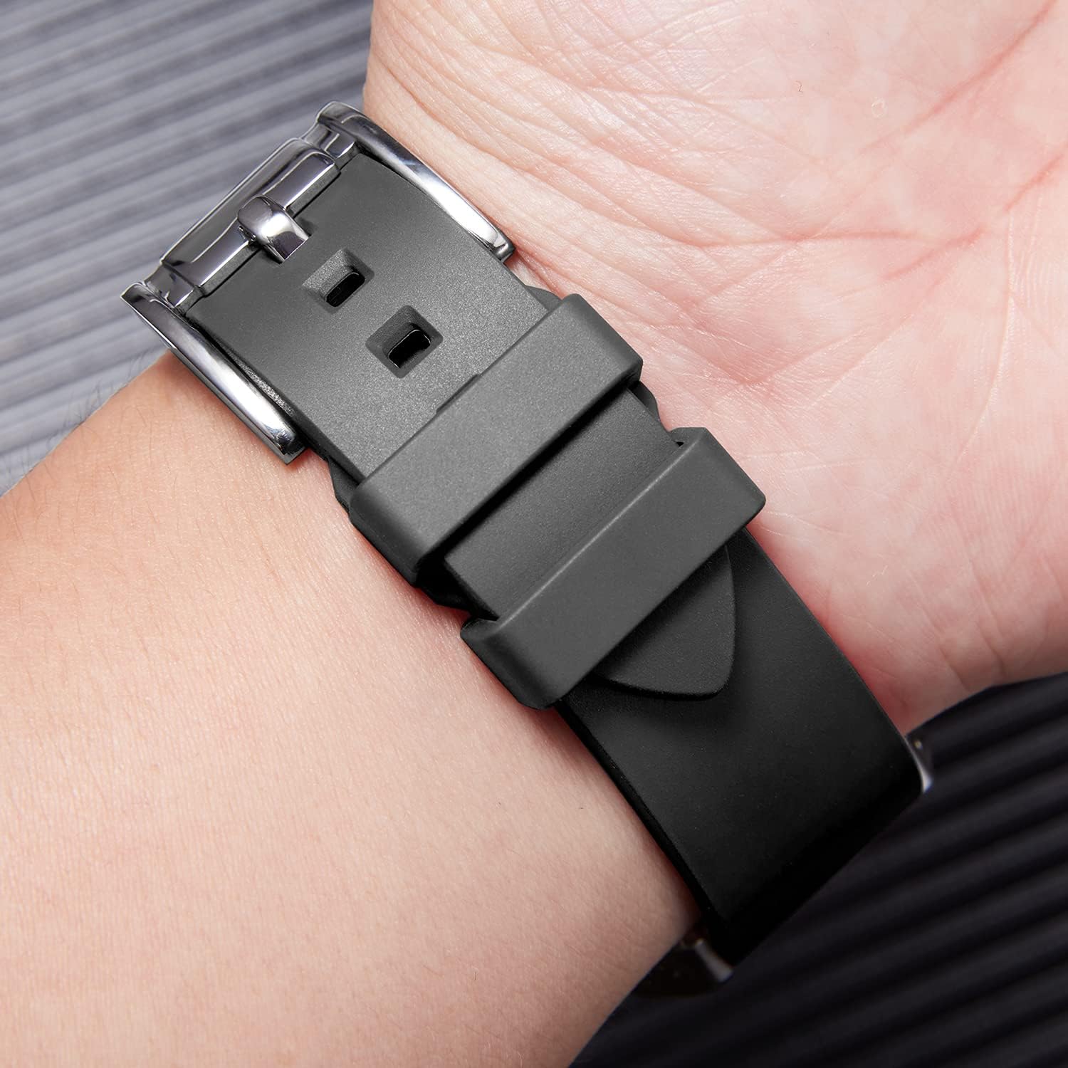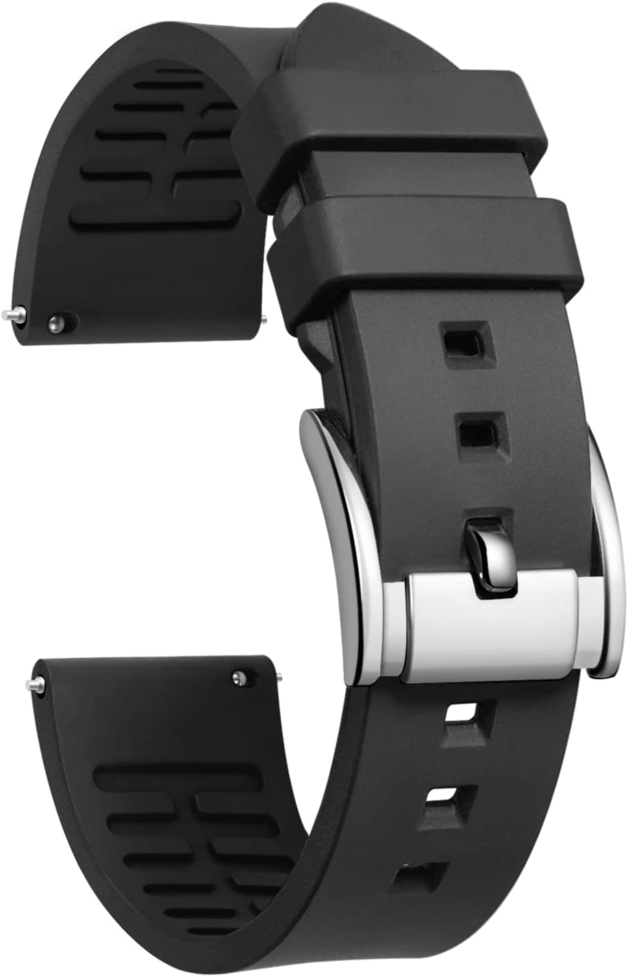 【Perfect shape】The radian shape of the Fluoro rubber watch band improves wrist fit, and the groove design on the reverse side promotes airflow and moisture dissipation, keeping the wrist dry and breathable.