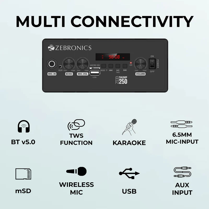 . BT v5.0 / USB / mSD / AUX / FM / Mic In