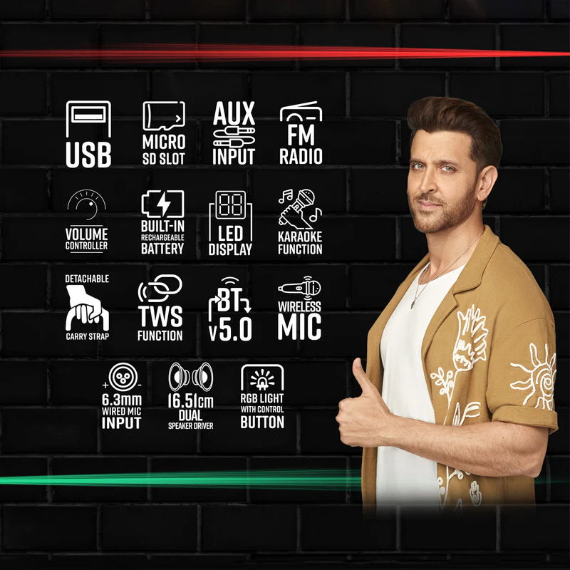 . BT v5.0 / USB / mSD / AUX / FM / Mic In